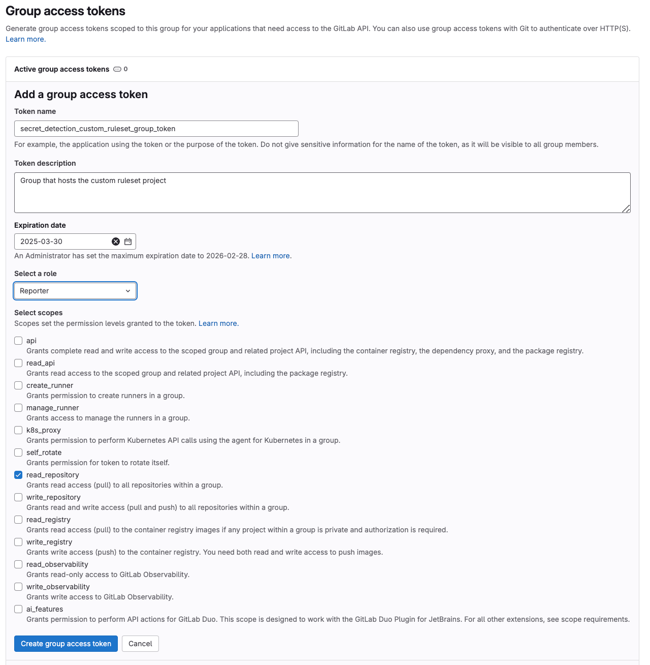 In order to access the custom ruleset, you need to create a group access token which generates a bot user. The bot user can be used to authenticate and access the custom ruleset by any projects that run the secret detection with the global policy.