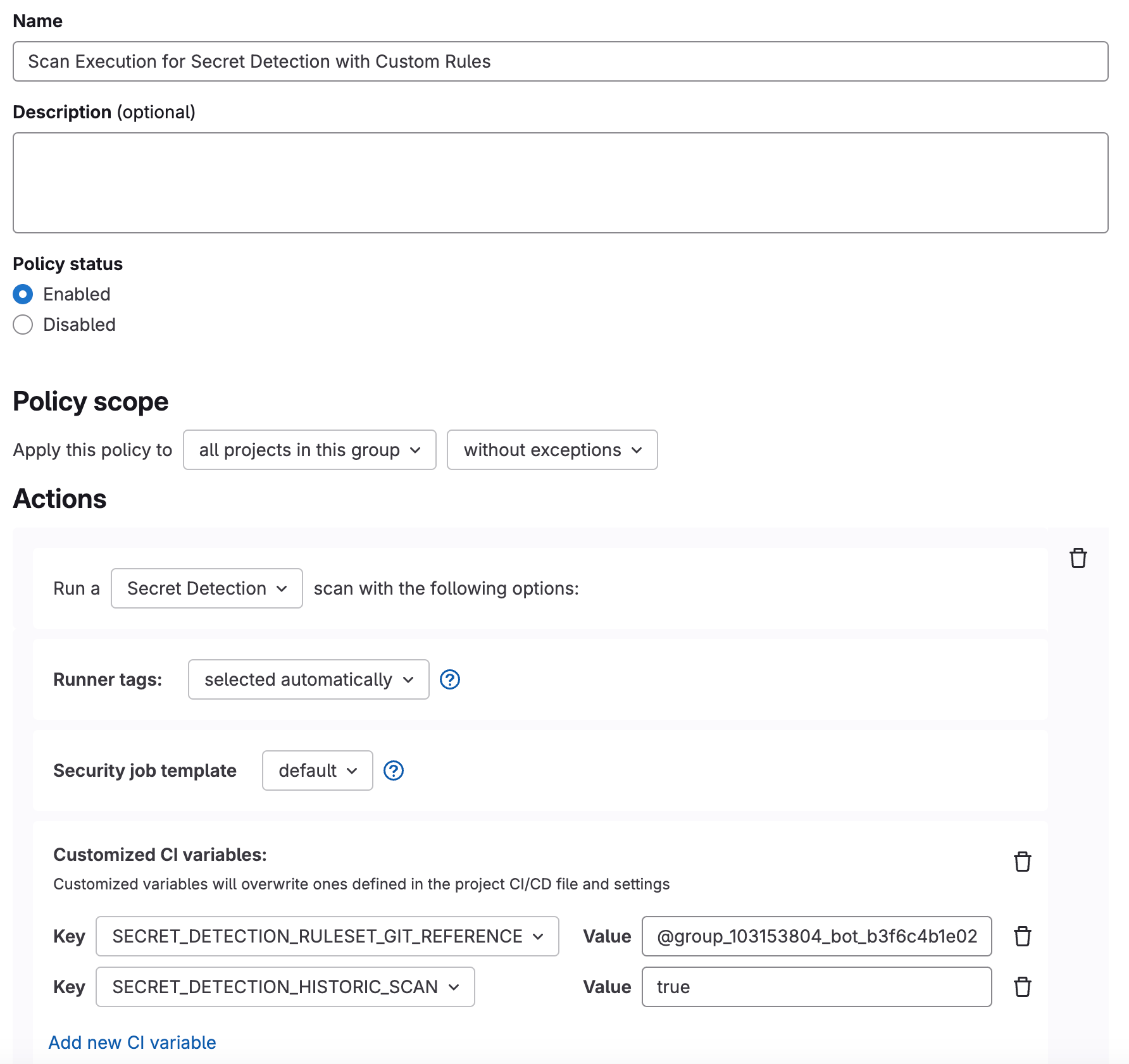 To run secret detection automatically in the pipeline as the enforced global policy, set up the policy at the highest level (in this case, for the top-level group). To create the new secret detection policy: