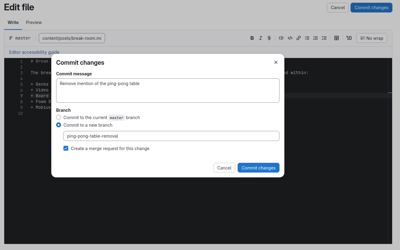 It is possible to commit (save) your changes directly to the file. However, this is not recommended for most teams, as it is good practice to first have your changes reviewed by a team member. In this step, you’ll create a branch and merge request with the new changes.
