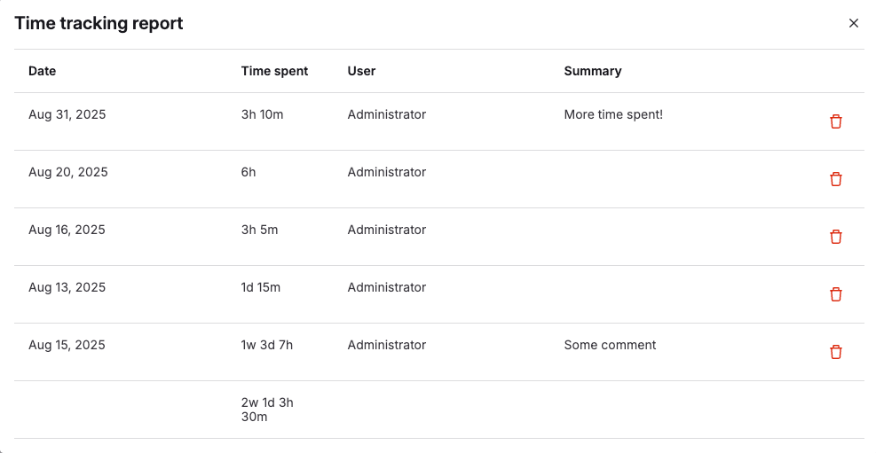 - In the time tracking report, on the right of a timelog entry, select Delete time spent ( ).